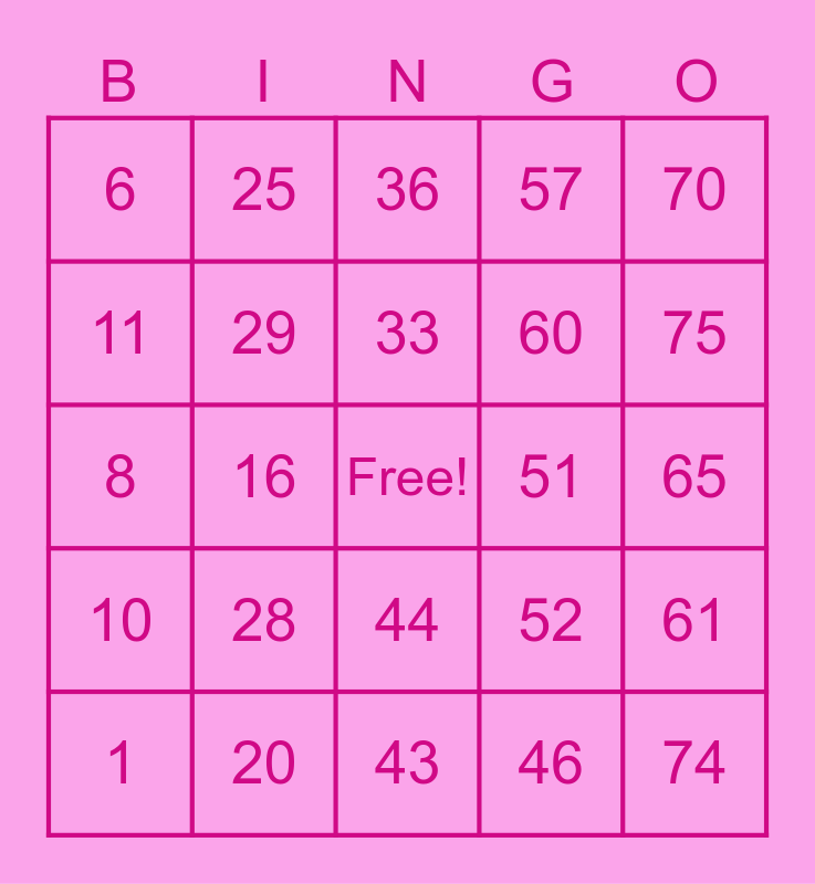 This bingo card has a free space and 24 words: 1, 28, 33, 46, 70, 6, 25, 36, 51, 65, 8, 29, 52, 61, 11, 20, 43, 57, 75, 10, 16, 44, 60 and 74.