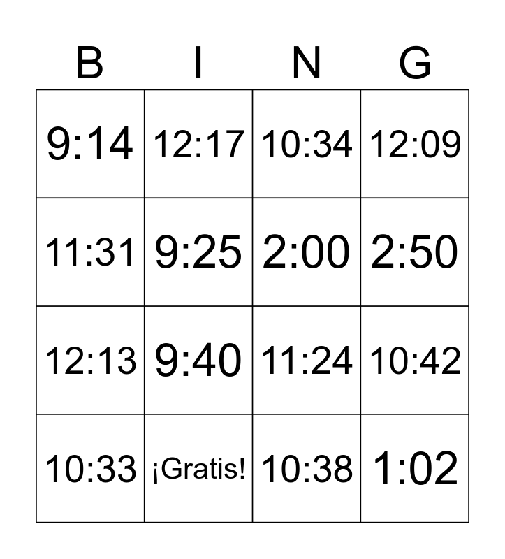 This bingo card has 28 words: 10:30, 11:28, 12:13, 1:06, 9:25, 10:34, 12:17, 1:02, ¡Gratis!, 9:35, 11:24, 12:09, 8:20, 8:35, 9:40, 11:20, 1:56, 2:00, 2:50, 9:00, 9:14, 9:58, 10:33, 10:42, 10:38, 11:27, 11:31 and 1:40.