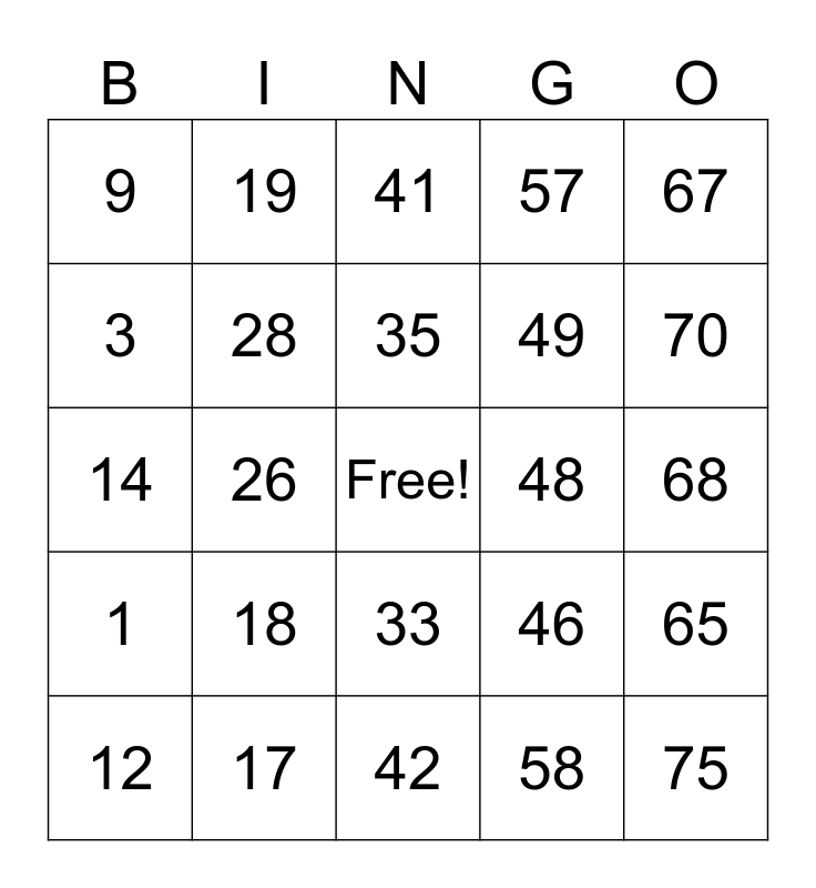 This bingo card has a free space and 24 words: 12, 18, 35, 58, 67, 9, 19, 41, 48, 68, 14, 28, 46, 65, 3, 17, 42, 57, 70, 1, 26, 33, 49 and 75.