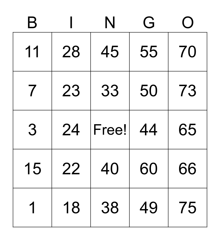 This bingo card has a free space and 24 words: 1, 22, 33, 49, 70, 11, 28, 45, 44, 65, 3, 23, 60, 66, 7, 18, 38, 55, 73, 15, 24, 40, 50 and 75.