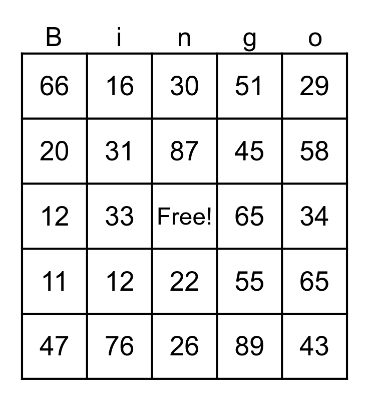 This bingo card has a free space and 24 words: 12, 76, 87, 47, 29, 66, 20, 16, 65, 22, 45, 12, 55, 65, 31, 89, 34, 30, 58, 33, 43, 11, 51 and 26.