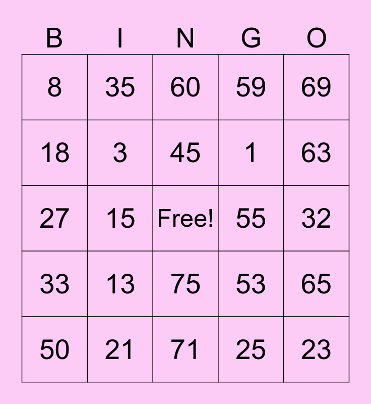 This bingo card has a free space and 24 words: 13, 21, 45, 50, 69, 8, 18, 35, 55, 75, 1, 27, 53, 65, 3, 25, 32, 60, 63, 15, 23, 33, 59 and 71.
