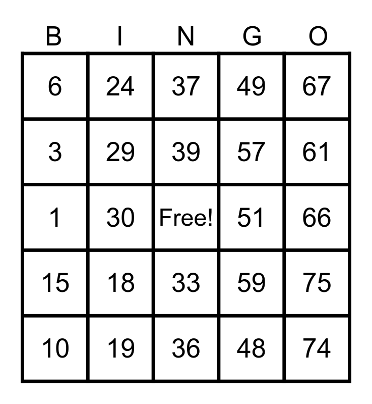 This bingo card has a free space and 24 words: 10, 18, 39, 48, 67, 6, 24, 37, 51, 66, 1, 29, 59, 75, 3, 19, 36, 49, 61, 15, 30, 33, 57 and 74.