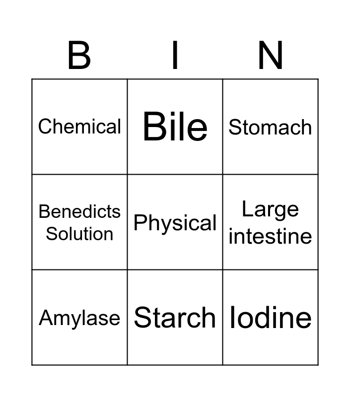 This bingo card has a free space and 8 words: Large intestine, Stomach, Bile, Amylase, Chemical, Iodine, Benedicts Solution and Starch.