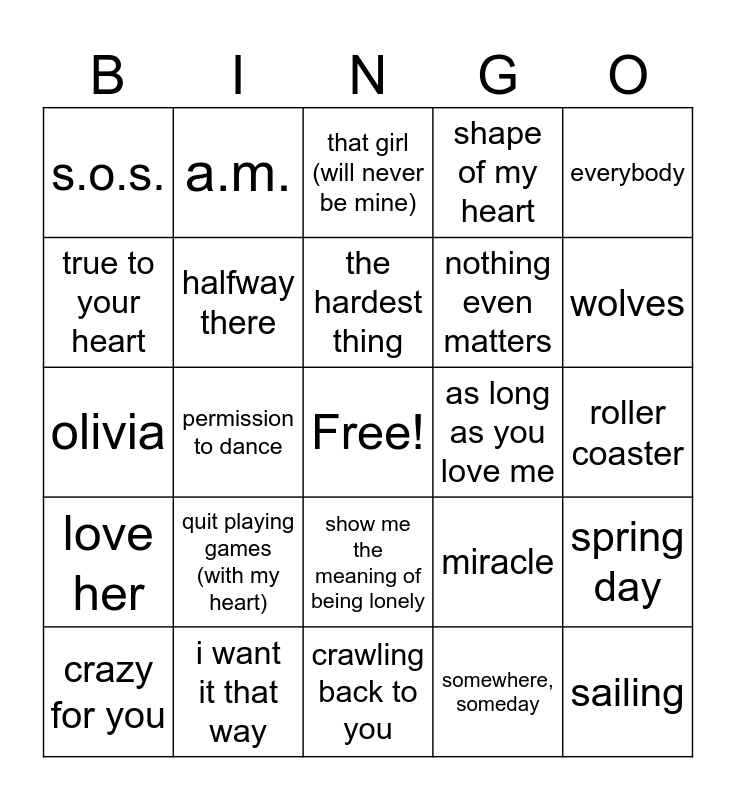 This bingo card has a free space and 45 words: Musi of my heart, sailing, just don't tell me that, crazy for you, the two of us, somewhere, someday, that girl (will never be mine), see right through you, everybody, i want it that way, shape of my heart, as long as you love me, show me the meaning of being lonely, quit playing games (with my heart), lose it all, crawling back to you, never enough, olivia, history, wolves, a.m., i would, cool, s.o.s., sail away, roller coaster, X (with Karo G), Lovebug, miracle, love her, life goes on, spring day, black swan, boy with luv, dynamite, permission to dance, fake love, blood sweat & tears, idol, the hardest thing, true to your heart, nothing even matters, worldwide, halfway there and count on you.