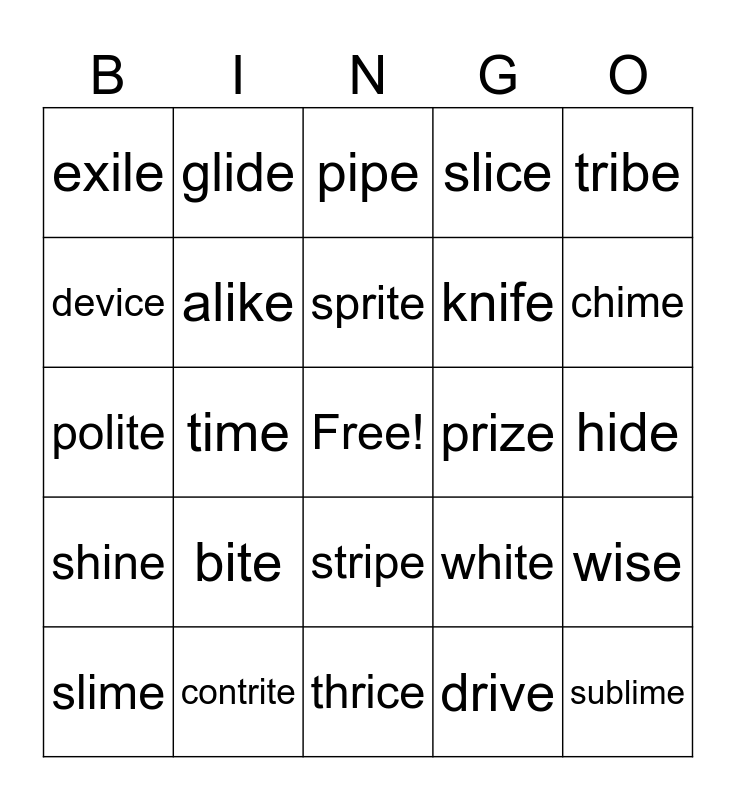This bingo card has a free space and 24 words: bite, contrite, sprite, slime, tribe, exile, device, glide, prize, stripe, knife, polite, white, wise, alike, drive, hide, pipe, chime, time, sublime, shine, slice and thrice.