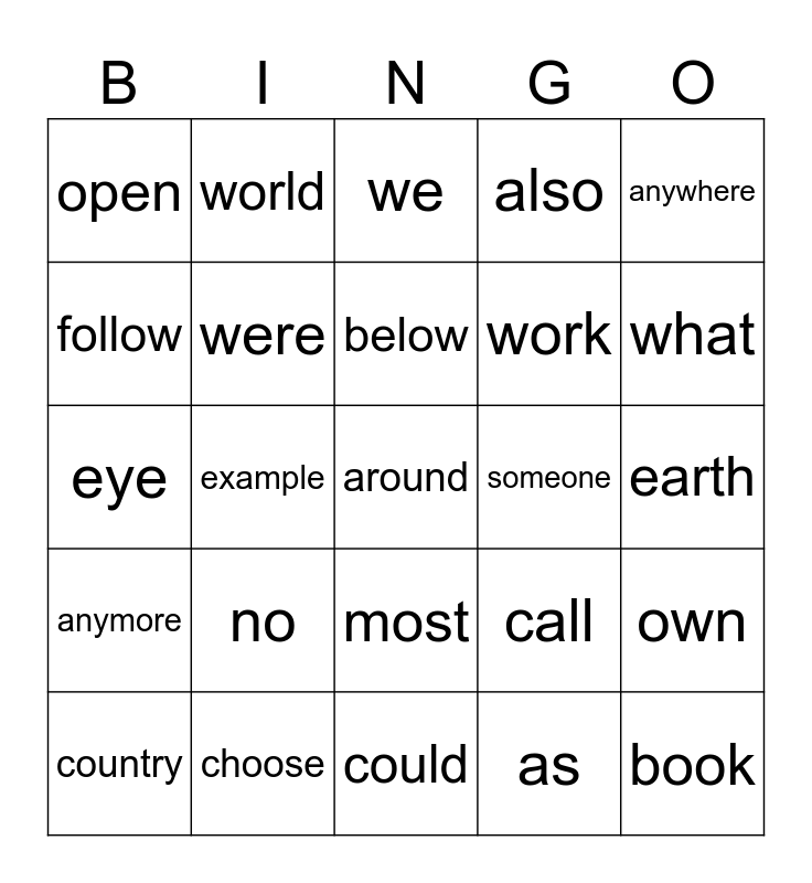 This bingo card has a free space and 29 words: country, different, example, me, open, we, were, no, someone, choose, earth, book, could, as, what, more, most, anymore, anywhere, eye, call, paper, work, follow, also, world, own, below and put.