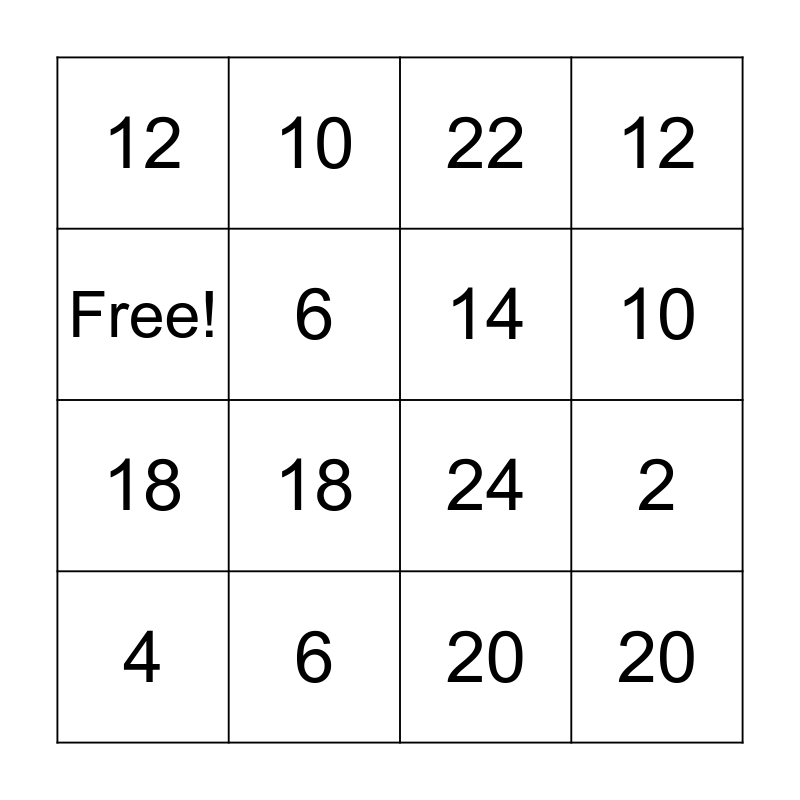 This bingo card has 20 words: 2, 14, 22, 8, 4, Free!, 6, 12, 18, 10, 18, 24, 6, 20, 14, 16, 10, 12, 20 and 24.