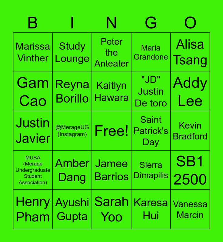 This bingo card has a free space and 24 words: Amber Dang, Ayushi Gupta, Kaitlyn Hawara, Henry Pham, Alisa Tsang, Marissa Vinther, Gam Cao, Study Lounge, Saint Patrick's Day, Jamee Barrios, "JD" Justin De toro, Justin Javier, Sierra Dimapilis, SB1 2500, Reyna Borillo, Karesa Hui, Kevin Bradford, Peter the Anteater, Addy Lee, @MerageUG (Instagram), Vanessa Marcin, MUSA (Merage Undergraduate Student Association), Maria Grandone and Sarah Yoo.