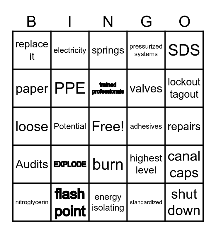 This bingo card has a free space and 24 words: EXPLODE, flash point, trained professionals, nitroglycerin, SDS, replace it, paper, electricity, adhesives, burn, valves, loose, highest level, canal caps, PPE, standardized, repairs, springs, lockout tagout, Potential, shut down, Audits, pressurized systems and energy isolating.
