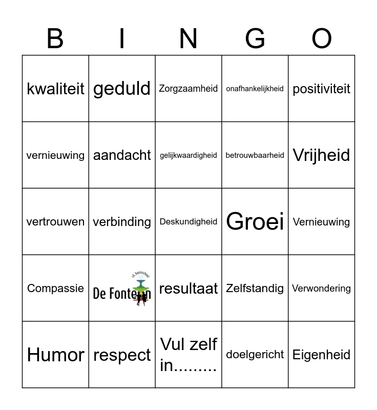 This bingo card has 1 images, a free space and 23 words: respect, gelijkwaardigheid, Humor, positiviteit, kwaliteit, vernieuwing, geduld, Groei, resultaat, betrouwbaarheid, vertrouwen, Zelfstandig, Verwondering, aandacht, doelgericht, Vernieuwing, Zorgzaamheid, Vrijheid, verbinding, Eigenheid, Compassie, onafhankelijkheid and Vul zelf in..........
