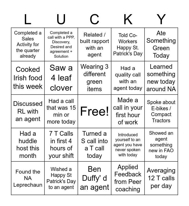 This bingo card has a free space and 24 words: 7 T Calls in first 4 hours of your shift, Wished a Happy St Patrick's Day to an agent, Wearing 3 different green items, Found the NA Leprechaun, Ate Something Green Today, Completed a Sales Activity for the quarter already, Cooked Irish food this week, Completed a call with a PPP, Discovery, Desired and agreement + Solution, Made a call in your first hour of work, Turned a S call into a T call today, Had a quality call with an agent today, Discussed RL with an agent, Introduced yourself to an agent you have never spoken with today, Showed an agent something new in FAO today, Saw a 4 leaf clover, Applied Feedback from Peer coaching, Spoke about E-bikes / Compact Tractors, Related / built rapport with an agent, Learned something new today around NA, Had a call that was 15 min or more today, Averaging 12 T calls per day, Had a huddle host this month, Told Co-Workers Happy St. Patrick's Day and Ben Duffy' d an agent.