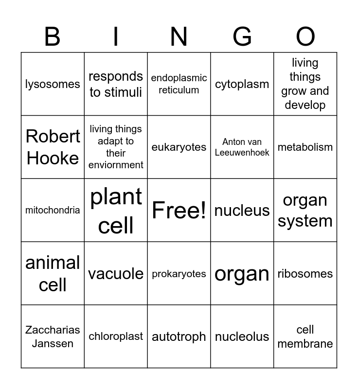 This bingo card has a free space and 40 words: level of orginization, mitochondria, cell, living things adapt to their enviornment, chloroplast, prokaryotes, eukaryotes, cell wall, living things grow and develop, animal cell, plant cell, cytoplasm, cell membrane, organ system, nucleus, vacuole, living things reproduce, lysosomes, golgi bodies, endoplasmic reticulum, ribosomes, nucleolus, Anton van Leeuwenhoek, Robert Hooke, Theodor Schwann, Matthias Schleiden, Rudolf Virchow, All living things are made of cells, organism, unicellular, multicellular, Zaccharias Janssen, little rooms, organ, metabolism, autotroph, heterotroph, obtain and use energy, responds to stimuli and maintain homeostasis.
