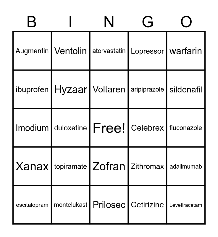 This bingo card has a free space and 29 words: escitalopram, Norvasc, duloxetine, Plavix, Augmentin, atorvastatin, Hyzaar, topiramate, Celebrex, montelukast, fluconazole, Levetiracetam, Prilosec, Cetirizine, sildenafil, Synthroid, Zofran, Xanax, warfarin, Imodium, Zithromax, Percocet, aripiprazole, ibuprofen, Lopressor, Ventolin, adalimumab, Voltaren and bupropion.
