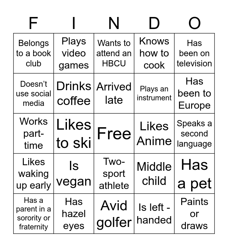 This bingo card has a free space and 24 words: Is vegan, Has hazel eyes, Arrived late, Has a parent in a sorority or fraternity, Has been on television, Belongs to a book club, Doesn’t use social media, Plays video games, Likes Anime, Two-sport athlete, Plays an instrument, Works part-time, Middle child, Has a pet, Drinks coffee, Is left -handed, Speaks a second language, Wants to attend an HBCU, Has been to Europe, Likes to ski, Paints or draws, Likes waking up early, Knows how to cook and Avid golfer.