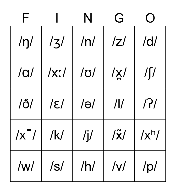 This bingo card has a free space and 44 words: /m/, /p/, /b/, /w/, /f/, /v/, /n/, /t/, /d/, /s/, /z/, /l/, /j/, /k/, /g/, /h/, /θ/, /ð/, /ɹ/, /ʃ/, /ʒ/, /tʃ/, /dʒ/, /ŋ/, /ɾ/, /ʔ/, /x̥/, /x̬/, /x̃/, /x˭/, /x ̚ /, /xʰ/, /i/, /ɪ/, /ɛ/, /æ/, /ʌ/, /u/, /ʊ/, /ɑ/, /x̪/, /x̆/, /xː/ and /xʷ/.