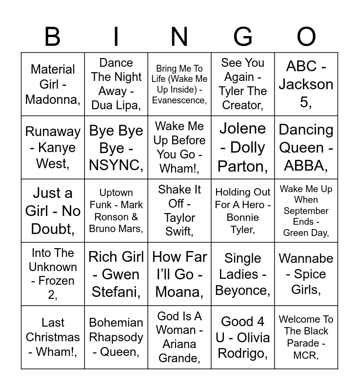 This bingo card has 47 words: Free!, Shake It Off - Taylor Swift,, Blank Space - Taylor Swift,, God Is A Woman - Ariana Grande,, Rich Girl - Gwen Stefani,, Careless Whisper - George Micheal,, Dance The Night Away - Dua Lipa,, Flower’s - Miley Cyrus,, Runaway - Kanye West,, Perfect - Ed Sheeran,, Bye Bye Bye - NSYNC,, See You Again - Tyler The Creator,, Wannabe - Spice Girls,, Single Ladies - Beyonce,, Can’t Stop The Feeling - Justin Timberlake,, What Makes You Beautiful - One Direction,, Wake Me Up Before You Go - Wham!,, Holding Out For A Hero - Bonnie Tyler,, Smooth Criminal - Michael Jackson,, ABC - Jackson 5,, Uptown Funk - Mark Ronson & Bruno Mars,, Good 4 U - Olivia Rodrigo,, Material Girl - Madonna,, Jolene - Dolly Parton,, Mockingbird - Eminem,, Dancing Queen - ABBA,, Last Christmas - Wham!,, Let It Go - Frozen,, How Far I’ll Go - Moana,, Into The Unknown - Frozen 2,, Part Of Your World - The Little Mermaid,, I'll Make A Man Out Of You - Mulan,, You're Welcome - Moana,, Friend Like Me - Aladdin,, Smells Like Teen Spirit - Nirvana,, Bohemian Rhapsody - Queen,, Wake Me Up When September Ends - Green Day,, We Will Rock You - Queen,, Another One Bites The Dust - Queen,, Centuries - Fall Out Boys,, Welcome To The Black Parade - MCR,, Bring Me To Life (Wake Me Up Inside) - Evanescence,, Just a Girl - No Doubt,, Don’t Stop Believing - Journey,, We Didn’t Start The Fire - Billy Joel,, Dream On - Aerosmith, and Heroes - David Bowie,.