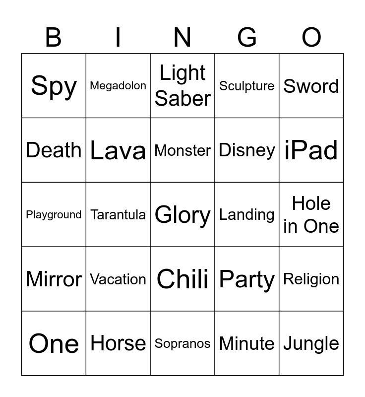 This bingo card has a free space and 24 words: Vacation, Horse, Monster, One, Sword, Spy, Death, Megadolon, Landing, Chili, Disney, Playground, Party, Religion, Lava, Minute, Hole in One, Light Saber, iPad, Tarantula, Jungle, Mirror, Sculpture and Sopranos.