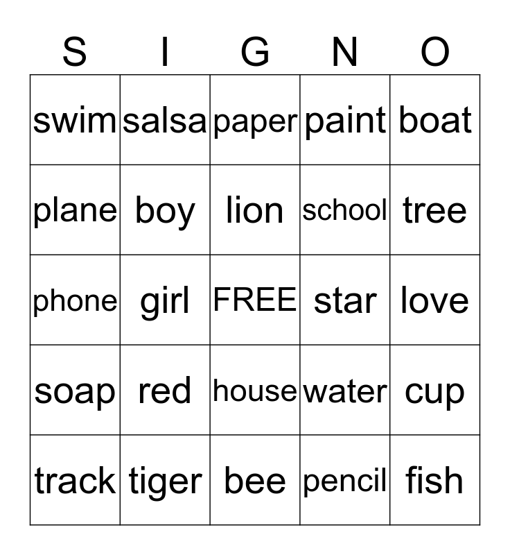This bingo card has a free space and 24 words: red, tiger, lion, track, boat, swim, plane, salsa, star, house, school, phone, water, cup, boy, pencil, love, paper, tree, girl, fish, soap, paint and bee.