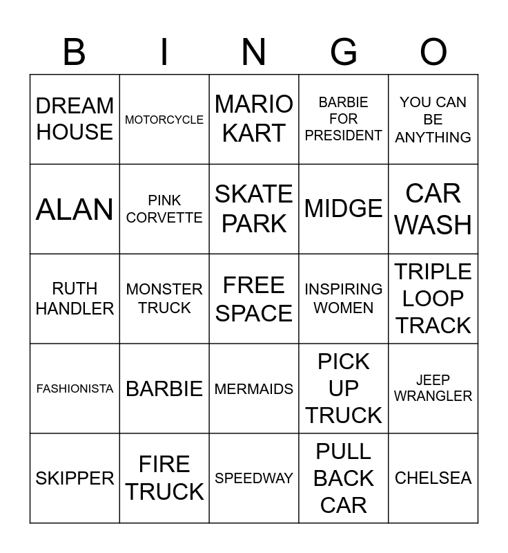 This bingo card has a free space and 29 words: SKIPPER, KEN, MONSTER TRUCK, ULTIMATE GARAGE, DREAM HOUSE, MARIO KART, PINK CORVETTE, BARBIE, INSPIRING WOMEN, FIRE TRUCK, TRIPLE LOOP TRACK, CHELSEA, SPEEDWAY, PULL BACK CAR, CAR WASH, STACIE, MERMAIDS, FASHIONISTA, YOU CAN BE ANYTHING, RUTH HANDLER, PICK UP TRUCK, REMOTE CONTROL CAR, MIDGE, ALAN, BARBIE FOR PRESIDENT, MOTORCYCLE, JEEP WRANGLER, SKATE PARK and DREAM CAMPER.