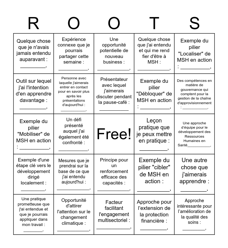 This bingo card has a free space and 29 words: Une pratique prometteuse que j'ai entendue et que je pourrais appliquer dans mon travail : ________,, Une innovation intéressante que j'ai entendue présentée : __________,, Un défi présenté auquel j'ai également été confronté : ___________,, Un projet sur lequel j'aimerais en savoir plus : ______________,, Quelque chose que je n'avais jamais entendu auparavant : _________,, Une opportunité potentielle de nouveau business : ____________,, Personne avec laquelle j'aimerais entrer en contact pour en savoir plus après les présentations d'aujourd'hui : ____________,, Mesures que je prendrai sur la base de ce que j'ai entendu aujourd'hui : _____________,, Leçon pratique que je peux mettre en pratique : _________,, Opportunité d'attirer l'attention sur le changement climatique : ____________,, Une approche d’équipe pour le développement des Ressources Humaines en Santé___________,, Approche intéressante pour l’amélioration de la qualité des soins : _________,, Facteur facilitant l'engagement multisectoriel : ____________,, Approche pour l’extension de la protection financière : _________,, Des compétences en matière de gouvernance qui comptent pour la gestion de la chaîne d'approvisionnement : ____________,, Exemple d'innovation numérique : _______,, Principe pour un renforcement efficace des capacités : ____________,, Exemple d'une étape clé vers le développement dirigé localement : _________,, Exemple du pilier "Localiser" de MSH en action : __________,, Exemple du pilier "Mobiliser" de MSH en action : __________,, Exemple du pilier "cibler" de MSH en action : __________,, Exemple du pilier "Démontrer" de MSH en action : __________,, Exemple du pilier "Débloquer" de MSH en action : __________,, Outil sur lequel j'ai l'intention d'en apprendre davantage : _________,, Quelque chose que j'ai entendu et qui me rend fier d'être à MSH : ____________,, Expérience connexe que je pourrais partager cette semaine : ___________,, Une autre chose que j'aimerais apprendre : ________,, Présentateur avec lequel j'aimerais discuter pendant la pause-café : ___________ and Leçon opérationnelle apprise : ____________.