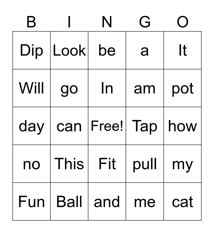 This bingo card has a free space and 24 words: This, Ball, In, Fun, It, Dip, Will, Look, Tap, Fit, am, day, pull, my, go, me, how, be, pot, can, cat, no, a and and.