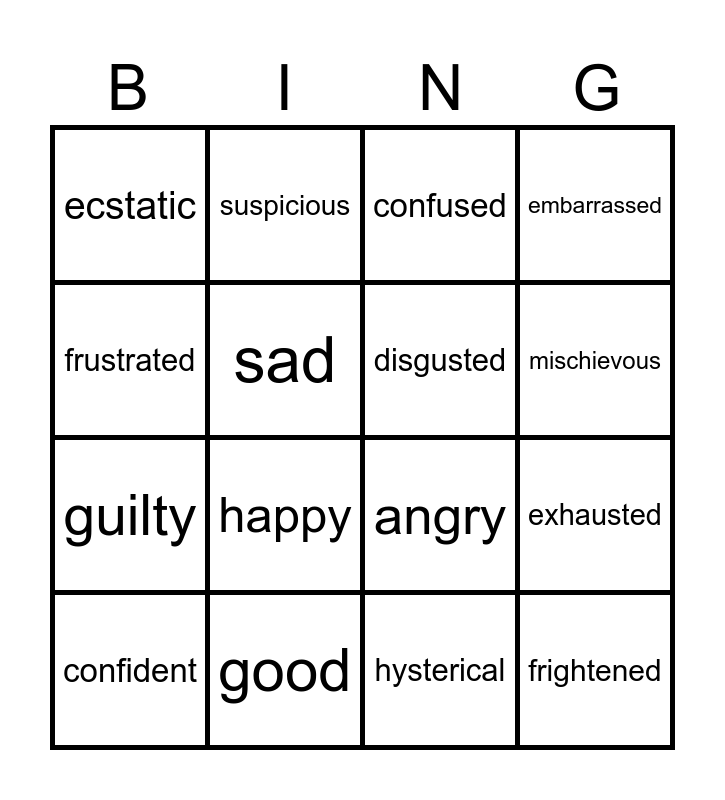 This bingo card has 16 words: good, exhausted, confused, ecstatic, guilty, suspicious, angry, hysterical, frustrated, sad, confident, embarrassed, happy, mischievous, disgusted and frightened.
