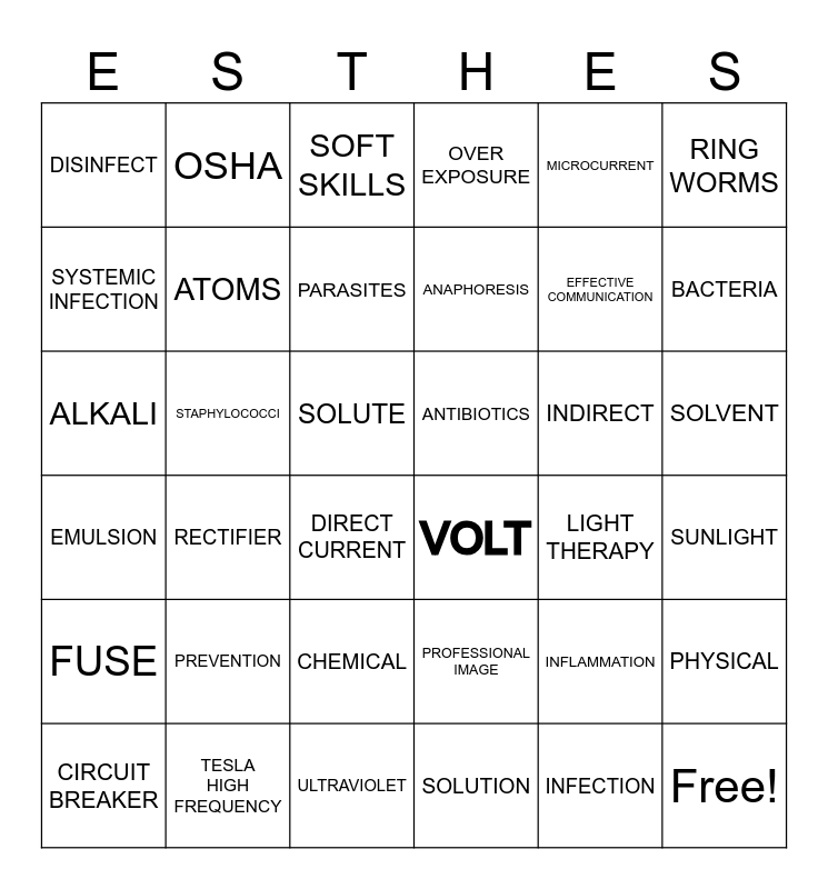 This bingo card has 42 words: INFECTION, ATOMS, GROUNDING, INDIRECT, SUNLIGHT, RECTIFIER, ALKALI, NEUTRALIZE, SOFT SKILLS, SOLVENT, SOLUTE, ANAPHORESIS, BACTERIA, MICROCURRENT, TESLA HIGH FREQUENCY, EMULSION, PHYSICAL, EFFECTIVE COMMUNICATION, Free!, OSHA, RING WORMS, CHEMICAL, FUSE, DISINFECT, SURFACTANT, CIRCUIT BREAKER, PARASITES, POTENTIAL HYDROGEN, PREVENTION, INFLAMMATION, RESUME, ANTIBIOTICS, SYSTEMIC INFECTION, LIGHT THERAPY, ULTRAVIOLET, DIRECT CURRENT, VOLT, STAPHYLOCOCCI, PROFESSIONAL IMAGE, SOLUTION, OVER EXPOSURE and CATAPHORESIS.