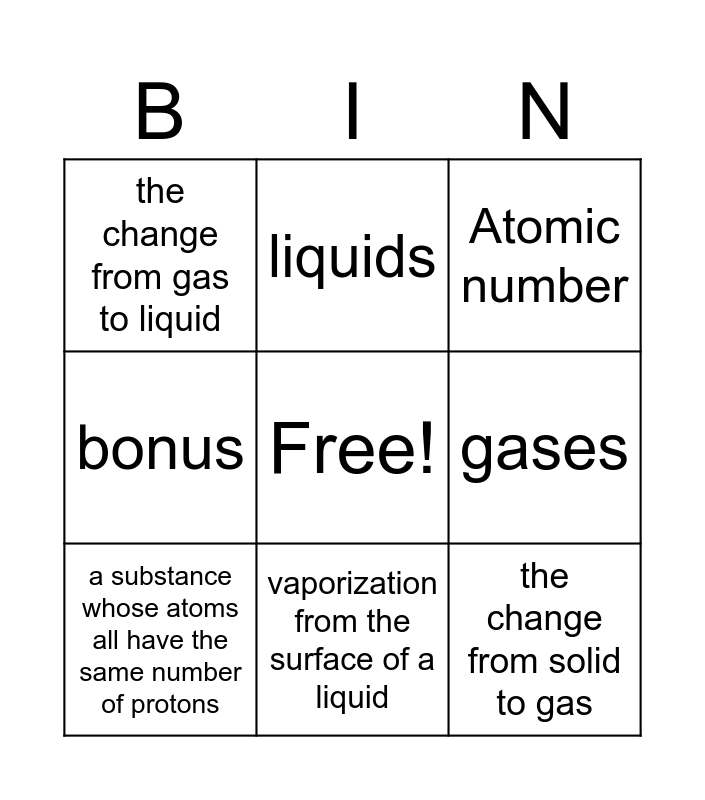 This bingo card has a free space and 8 words: gases, Atomic number, liquids, a substance whose atoms all have the same number of protons, the change from gas to liquid, the change from solid to gas, bonus and vaporization from the surface of a liquid.