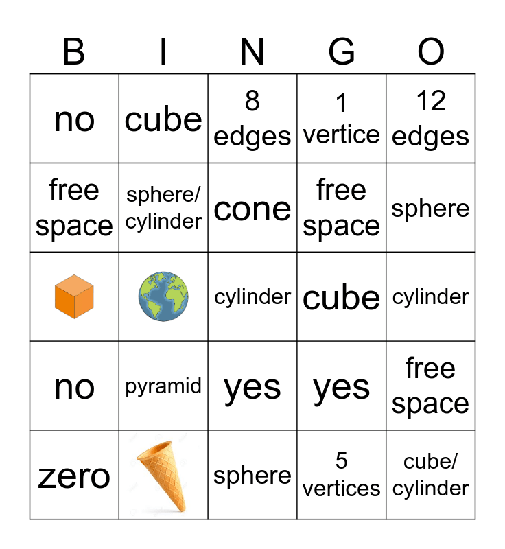 This bingo card has 3 images and 23 words: yes, 5 vertices, cone, 12 edges, no, free space, cube, cylinder, yes, free space, free space, zero, cylinder, 1 vertice, no, 8 edges, cylinder, sphere, sphere, cube, pyramid, sphere/ cylinder and cube/ cylinder.