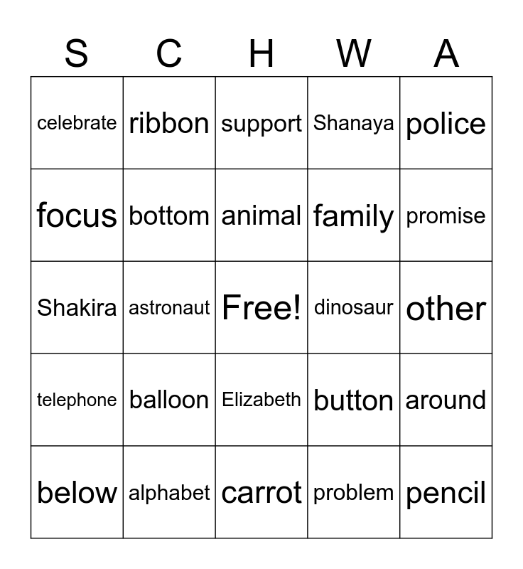 This bingo card has a free space and 24 words: balloon, alphabet, animal, below, police, celebrate, focus, ribbon, dinosaur, Elizabeth, family, Shakira, button, around, bottom, problem, other, support, promise, astronaut, pencil, telephone, Shanaya and carrot.