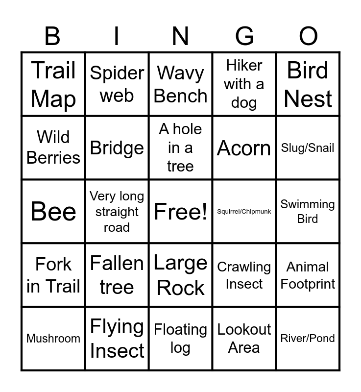 This bingo card has a free space and 31 words: Floating log, Fence, Very long straight road, Wild flower, Trail Map, Wavy Bench, Bridge, Crawling Insect, Squirrel/Chipmunk, Lookout Area, Swimming Bird, River/Pond, A Hiker wearing Black, Moss, Slug/Snail, Pine Cone, Animal Footprint, Fallen tree, Fork in Trail, Large Rock, Bird Nest, Snake, Mushroom, Spider web, Acorn, Wild Berries, Hiker with a dog, Bee, Flying Insect, A hole in a tree and Boat.