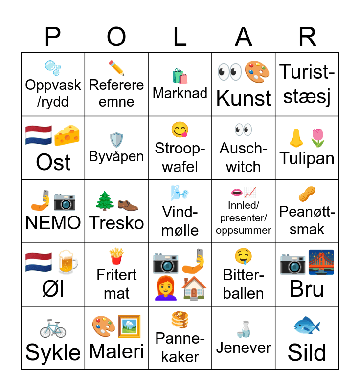 This bingo card has 25 words: π Fritert mat, π₯ Panne-kaker, π Stroop-wafel, π² Sykle, Turist-stΓ¦sj, π«§ Oppvask /rydd, π³π±π§ Ost, βοΈ Referere emne, ππ Innled/ presenter/ oppsummer, π·π€³π©βπ¦°π , π Ausch-witch, π€³π· NEMO, π€€ Bitter-ballen, π·π Bru, π‘οΈ ByvΓ₯pen, π Sild, π₯ PeanΓΈtt-smak, ποΈ Marknad, ππ· Tulipan, π²π Tresko, π¬οΈ Vind-mΓΈlle, π¨πΌοΈ Maleri, π³π±πΊ Γl, ππ¨ Kunst and πΆ Jenever.