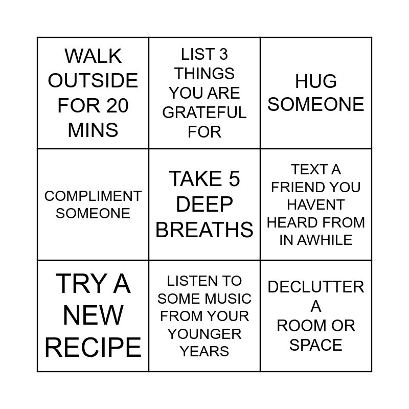 This bingo card has a free space and 8 words: TEXT A FRIEND YOU HAVENT HEARD FROM IN AWHILE, HUG SOMEONE, LIST 3 THINGS YOU ARE GRATEFUL FOR, TRY A NEW RECIPE, WALK OUTSIDE FOR 20 MINS, DECLUTTER A ROOM OR SPACE, COMPLIMENT SOMEONE and LISTEN TO SOME MUSIC FROM YOUR YOUNGER YEARS.