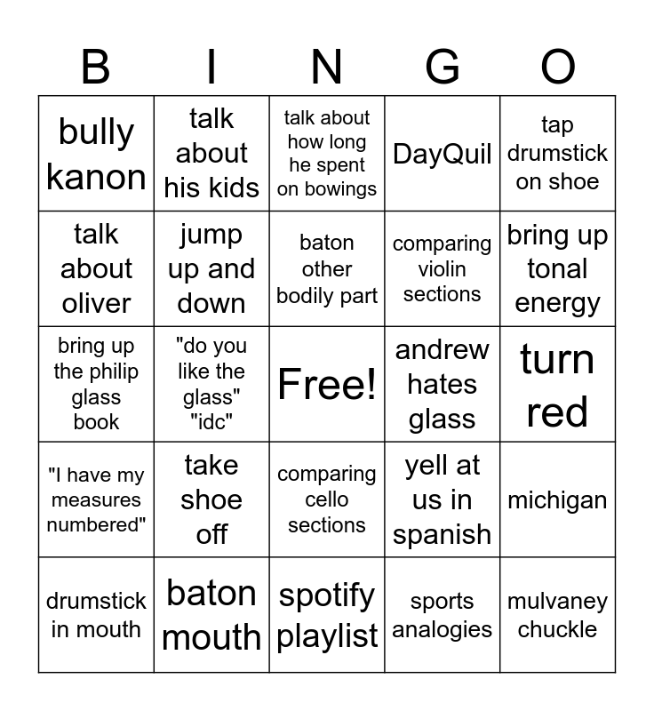 This bingo card has a free space and 24 words: take shoe off, baton mouth, baton other bodily part, drumstick in mouth, tap drumstick on shoe, bully kanon, talk about oliver, talk about his kids, andrew hates glass, comparing cello sections, comparing violin sections, bring up the philip glass book, yell at us in spanish, michigan, jump up and down, sports analogies, turn red, talk about how long he spent on bowings, bring up tonal energy, "do you like the glass" "idc", mulvaney chuckle, "I have my measures numbered", DayQuil and spotify playlist.