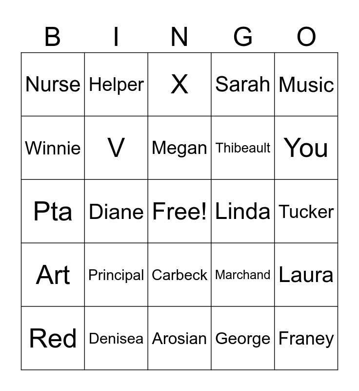 This bingo card has a free space and 29 words: Red, Tina, Diane, Lunch, Nurse, X, V, Principal, Linda, Denisea, Tucker, Franey, Arosian, George, You, Ackerman, Carbeck, Art, Music, Pta, Marchand, Doyle, Thibeault, Winnie, Sarah, Helper, Laura, Megan and Gallagher.