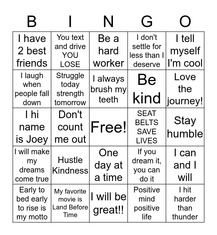 This bingo card has a free space and 24 words: Hustle Kindness, My favorite movie is Land Before Time, I always brush my teeth, Early to bed early to rise is my motto, I tell myself I'm cool, I have 2 best friends, I laugh when people fall down, You text and drive YOU LOSE, SEAT BELTS SAVE LIVES, One day at a time, Be kind, I hi name is Joey, If you dream it, you can do it, I can and I will, Struggle today strength tomorrow, Positive mind positive life, Stay humble, Be a hard worker, Love the journey!, Don't count me out, I hit harder than thunder, I will make my dreams come true, I don't settle for less than I deserve and I will be great!!.