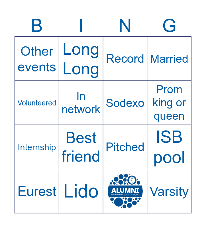 This bingo card has 1 images and 16 words: Eurest, Lido, Record, Married, Internship, In network, Pitched, Prom king or queen, Volunteered, Best friend, ISB pool, Other events, Long Long, Sodexo, Varsity and Business partner.