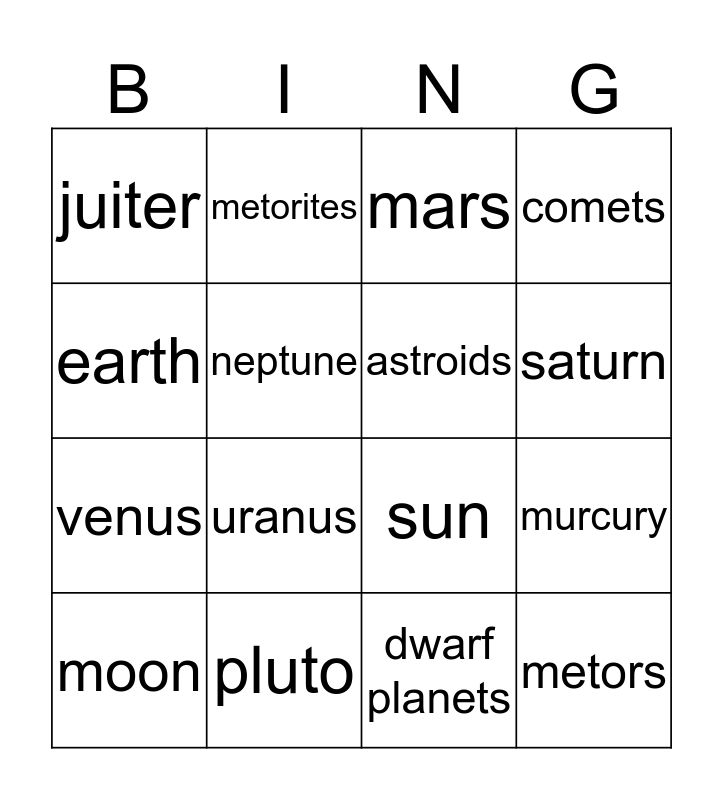 This bingo card has a free space and 15 words: moon, metors, mars, juiter, saturn, earth, uranus, dwarf planets, neptune, venus, murcury, comets, astroids, metorites and pluto.