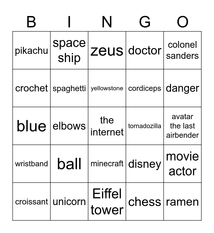 This bingo card has a free space and 24 words: ball, unicorn, yellowstone, croissant, colonel sanders, pikachu, crochet, space ship, tornadozilla, minecraft, cordiceps, blue, disney, movie actor, spaghetti, chess, avatar the last airbender, zeus, danger, elbows, ramen, wristband, doctor and Eiffel tower.
