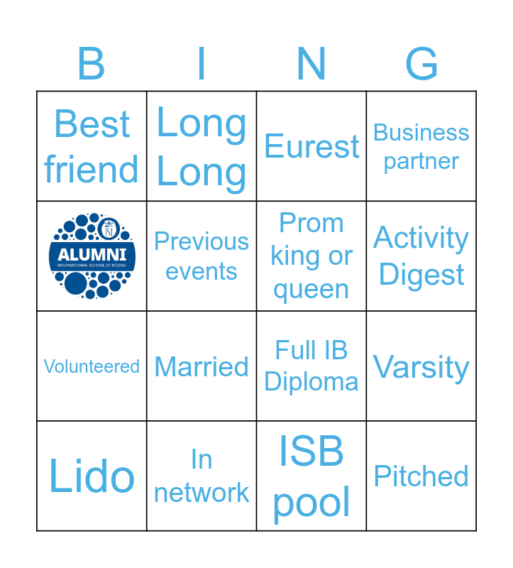 This bingo card has 1 images and 15 words: In network, Varsity, Eurest, Best friend, Volunteered, Long Long, Full IB Diploma, ISB pool, Previous events, Lido, Business partner, Married, Activity Digest, Prom king or queen and Pitched.