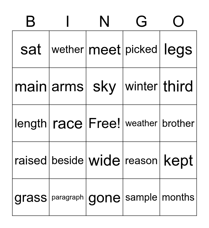 This bingo card has a free space and 25 words: beside, gone, sky, grass, legs, sat, main, wether, weather, wide, winter, length, reason, kept, arms, interest, brother, meet, third, race, months, paragraph, raised, picked and sample.