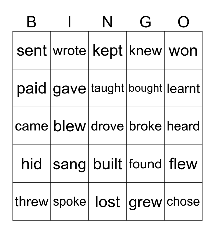 This bingo card has a free space and 24 words: sang, spoke, taught, threw, won, sent, paid, wrote, broke, built, bought, came, found, flew, gave, grew, heard, kept, learnt, blew, chose, hid, knew and lost.