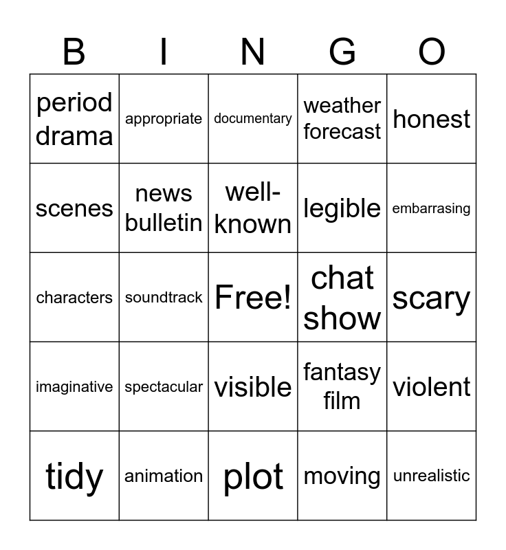 This bingo card has a free space and 31 words: plot, ending, soundtrack, actors, period drama, documentary, news bulletin, fantasy film, chat show, moving, scary, unrealistic, boring, convincing, embarrasing, exciting, violent, spectacular, imaginative, visible, honest, polite, tidy, appropriate, legible, scenes, weather forecast, characters, animation, well-known and confusing.
