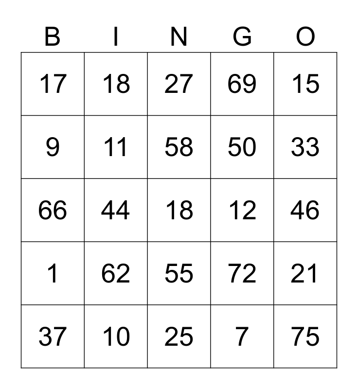 This bingo card has 25 words: 1, 10, 18, 7, 15, 17, 18, 27, 12, 21, 9, 11, 25, 72, 33, 37, 44, 58, 50, 46, 66, 62, 55, 69 and 75.