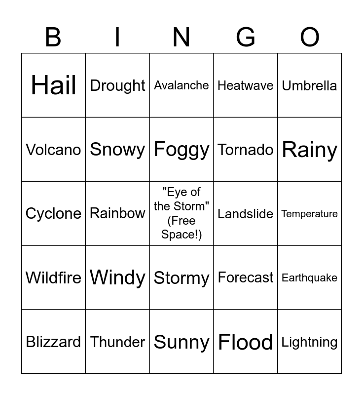 This bingo card has a free space and 28 words: Earthquake, Hurricane, Tornado, Flood, Volcano, Avalanche, Drought, Wildfire, Landslide, Blizzard, Cyclone, Heatwave, Thunder, Sunny, Rainy, Cloudy, Windy, Snowy, Foggy, Stormy, Hail, Thunderstorm, Lightning, Rainbow, Temperature, Forecast, Umbrella and Jacket.