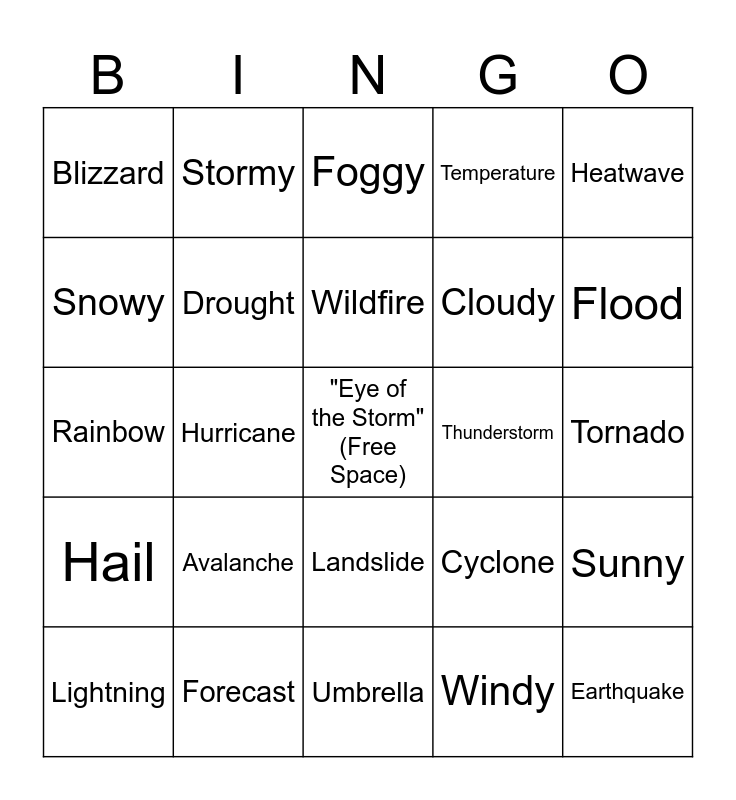 This bingo card has a free space and 28 words: Sunny, Rainy, Cloudy, Windy, Snowy, Foggy, Stormy, Hail, Thunderstorm, Lightning, Rainbow, Temperature, Forecast, Umbrella, Flood, Volcano, Avalanche, Drought, Wildfire, Landslide, Blizzard, Jacket, Earthquake, Hurricane, Tornado, Cyclone, Heatwave and Thunder.