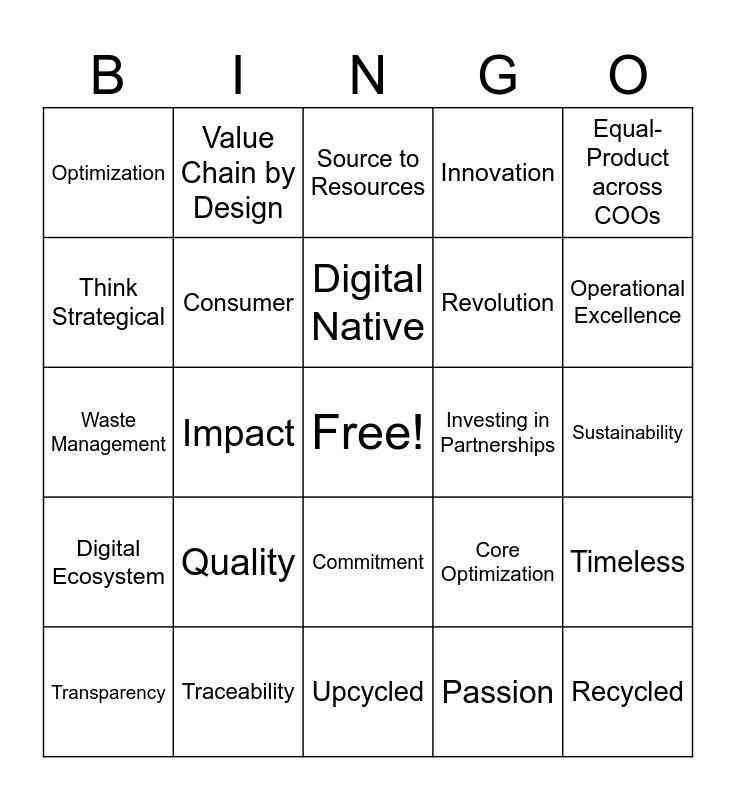 This bingo card has a free space and 36 words: Agility, Authenticity, Capabilities, Consumer, Core Optimization, Digital Ecosystem, Digital Native, Engagements, Equal-Product across COOs, Give Back, Impact, Innovation, Integrity, Investing in Partnerships, Operational Excellence, Optimization, People, Quality, Recycled, Source to Resources, Sustainability, Timeless, Traceability, Transparency, Upcycled, Value Chain by Design, Waste Management, Balance Magic & Logic, Revolution, Think Strategical, Inspiration, Congratulations, Passion, Commitment, Iconic Products and Direct-to-consumer.