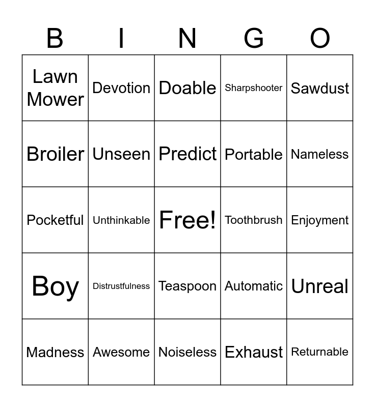 This bingo card has a free space and 189 words: Food, Soon, Feed, Flow, Spoon, Choose, Tooth, Rooster, Broom, Brain, Smooth, Scooter, Moonlight, Cartoon, Toothbrush, Schoolroom, Teaspoon, Shampoo, Raccoon, Afternoon, Unlock, Distrust, Agreeable, Handful, Unreal, Unchain, Helpful, Teachable, Drinkable, Faithful, Disgusting, Distrustful, Ungrateful, Yawn, Fault, Claw, Haul, Float, Draw, Spool, Crawl, Cool, Lawn, Loan, Cause, Exhaust, Author, Auburn, August, Drawing, Lawn Mower, Lawyer, Igloo, Imperfect, Advertise, Return, Preheat, Madness, Helpless, Refill, Unseen, Prepay, Discard, Endless, Freshness, Portable, Grateful, Returnable, Repayable, Unthinkable, Boastfulness, Unpreventable, Distrustfulness, Applause, Coleslaw, Withdrawn, Sawdust, Drawback, Autumn, Sweepstakes, Wayside, Bridegroom, Entertainment, Pretend, Report, Dismay, Unhurt, Nameless, Likeness, Affordable, Pocketful, Remarkable, Distinctness, Unteachable, Unthankfulness, Pauper, Sawmill, Because, Seesaw, Awesome, Launder, Autoharp, Automatic, Misinterpret, Understood, Predict, Unpack, Disgust, Speechless, Smoothness, Bucketful, Doable, Recording, Preventable, Presentable, Refillable, Boil, Boy, Point, Paint, Roy, Pawn, Joy, Soil, Goose, Coin, Cool, Noise, Turmoil, Employ, Enjoy, Destroy, Tinfoil, Boycott, Joyride, Oyster, Appointment, Sharpshooter, Become, Delay, Fraction, Beside, Defresot, Present, Rethink, Action, Mention, Coolness, Toothless, Belonging, Detention, Devotion, Reflection, Soybean, Noiseless, Annoy, Loiter, Exploit, Toyshop, Charcoal, Corduroy, Employee, Employer, Before, Depart, Section, Portion, Redefine, Destruction, Description, Prevention, Enjoy, Ointment, Poison, Convoy, Broiler, Avoid, Embroider, Disappoint, Destroyer, Enjoyment, Decay, Belong, Traction, Suction, Deduction, Bemoaning, Reaction and Unmentionable.