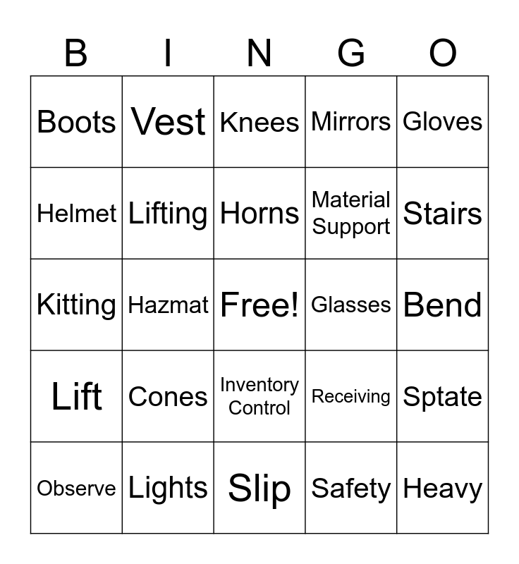 This bingo card has a free space and 24 words: Cones, Lights, Horns, Observe, Gloves, Boots, Helmet, Vest, Glasses, Inventory Control, Material Support, Kitting, Receiving, Sptate, Lifting, Safety, Bend, Knees, Stairs, Hazmat, Heavy, Lift, Mirrors and Slip.